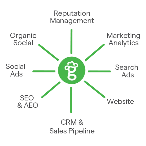 ROI forecasting, search ads, social ads, online listings, SEO & AEO, & custom website